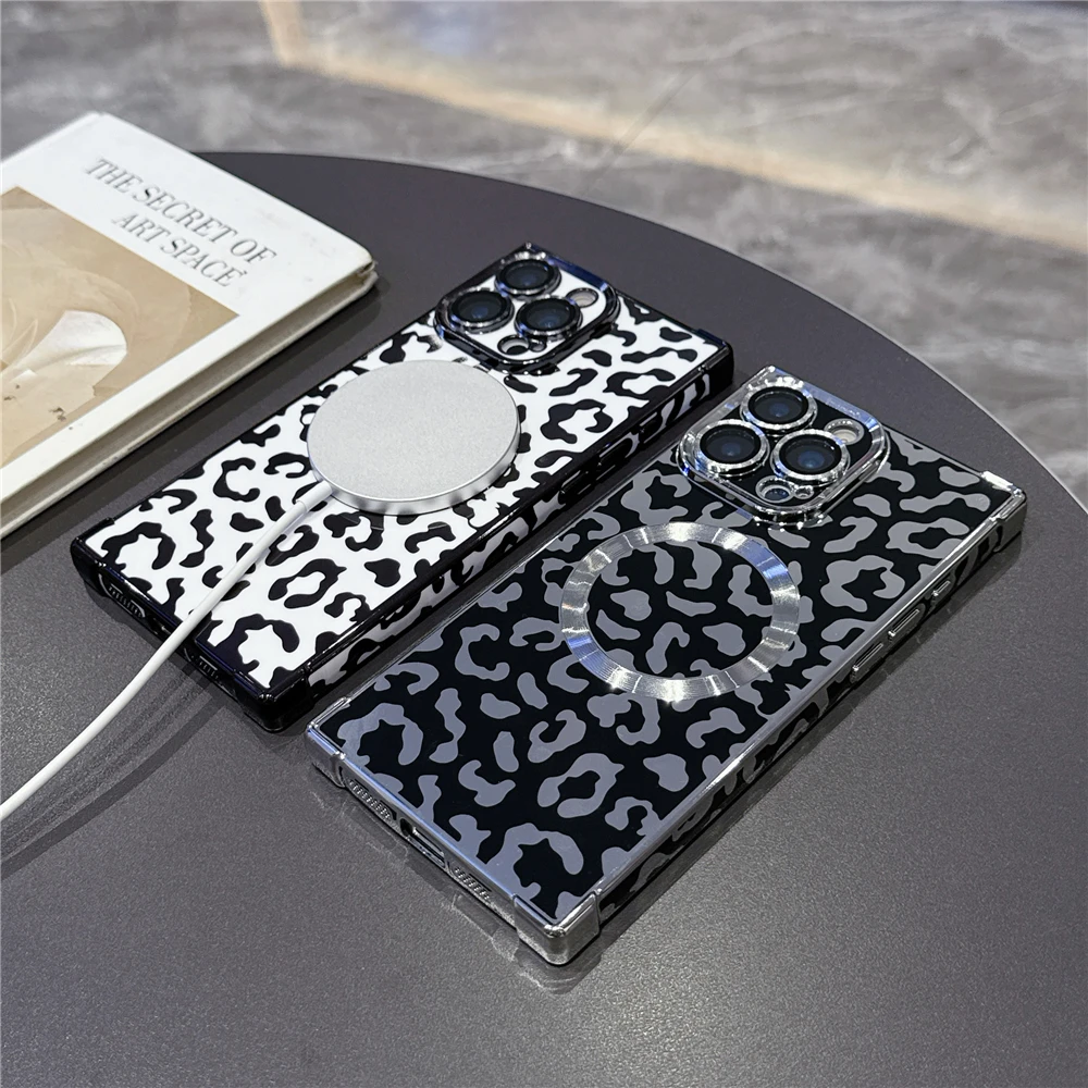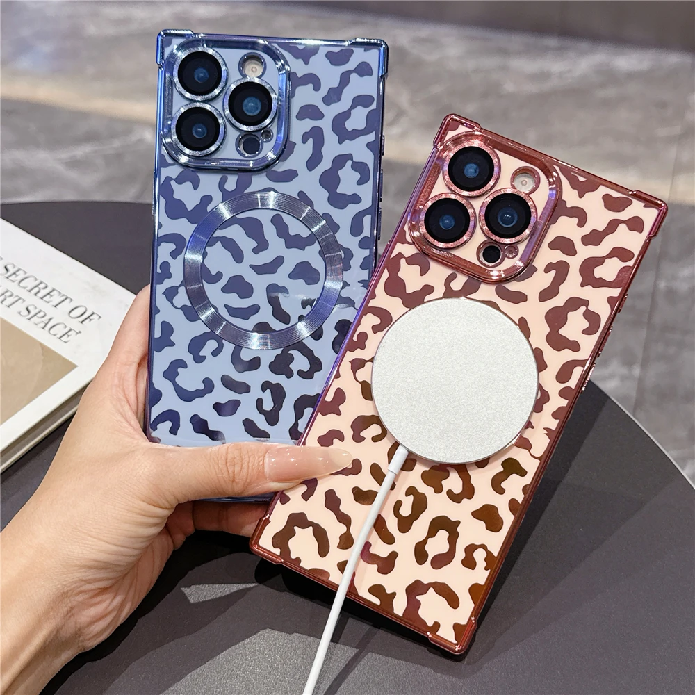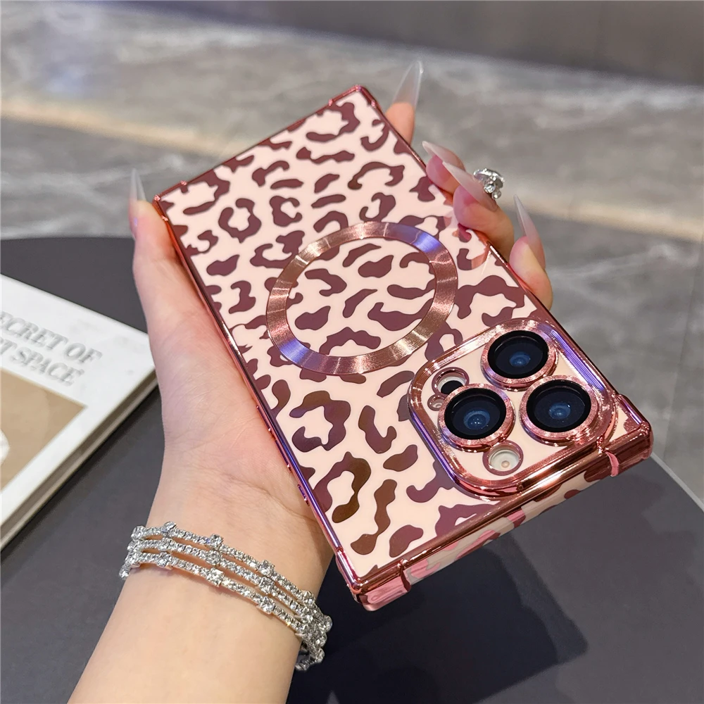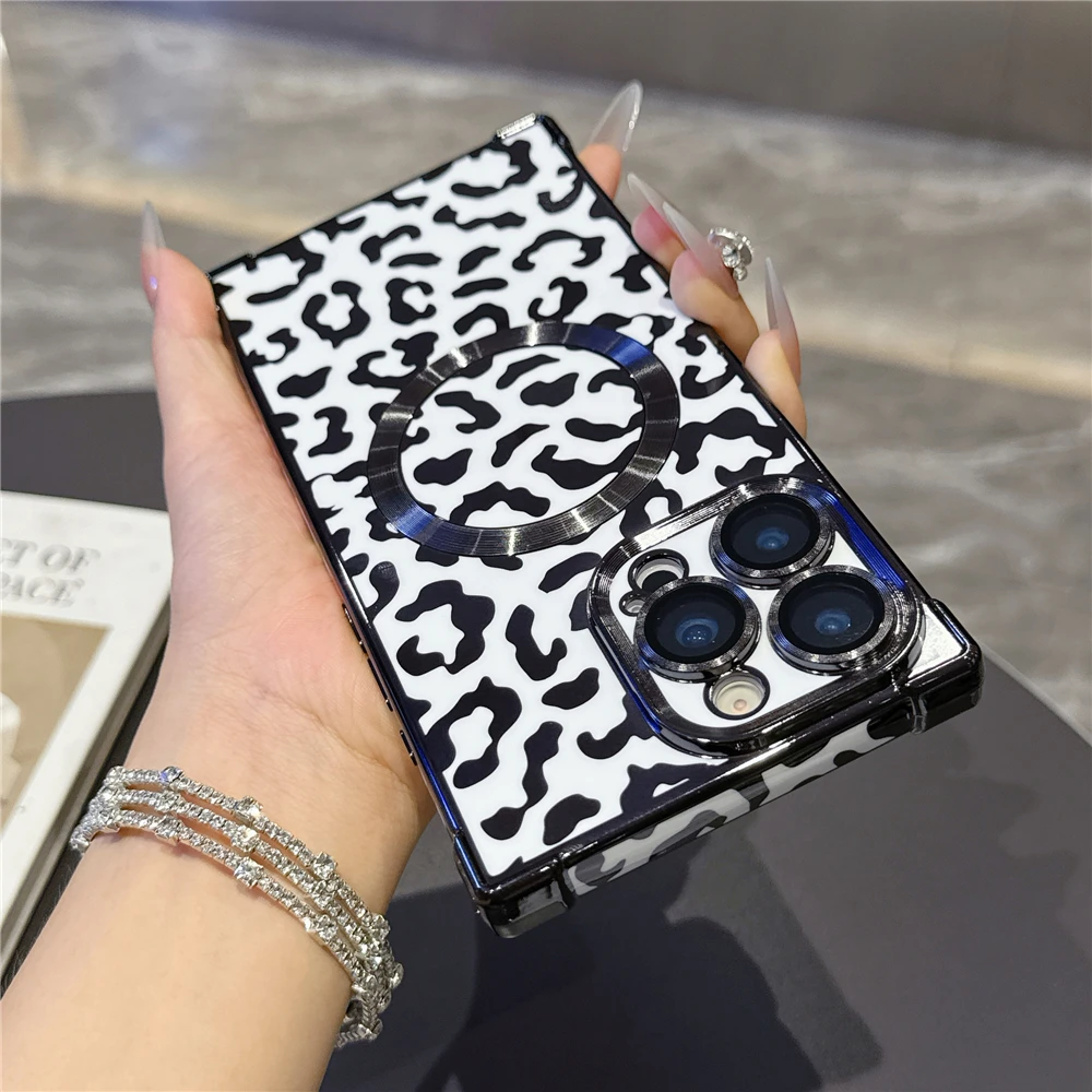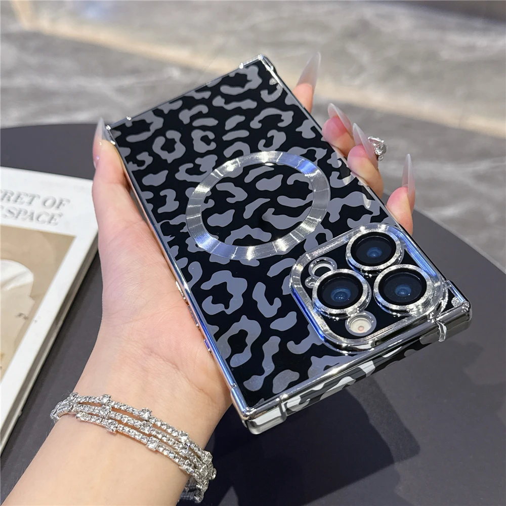 Feature: Luxury Plating Frame Leopard Print Magsafe Magnetic Lens Protective Phone Case