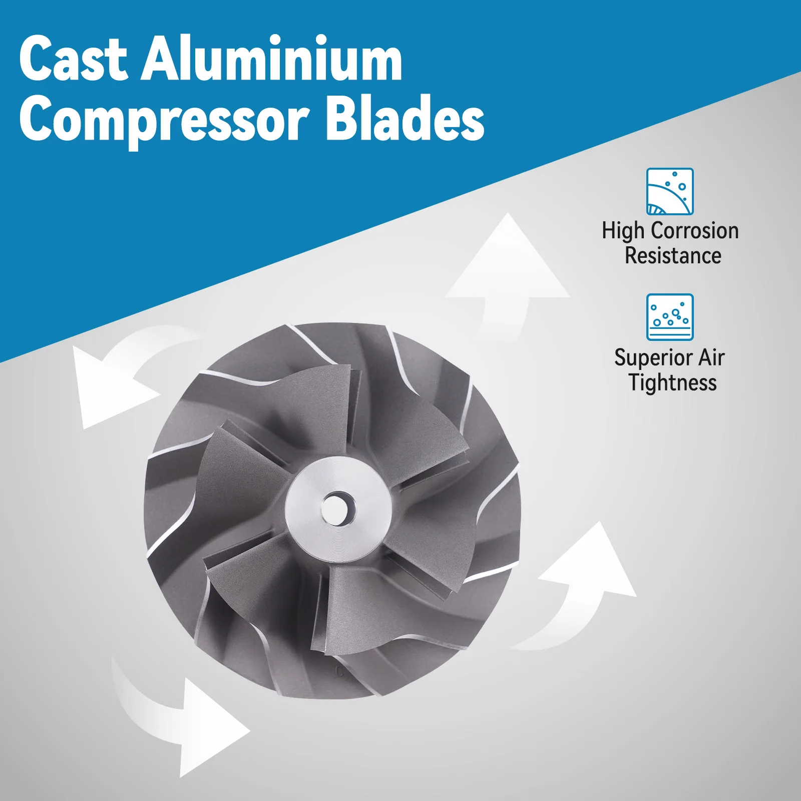 4. Compressor wheel/blades:Cast aluminium blades – superior air tightness & corrosion resistance