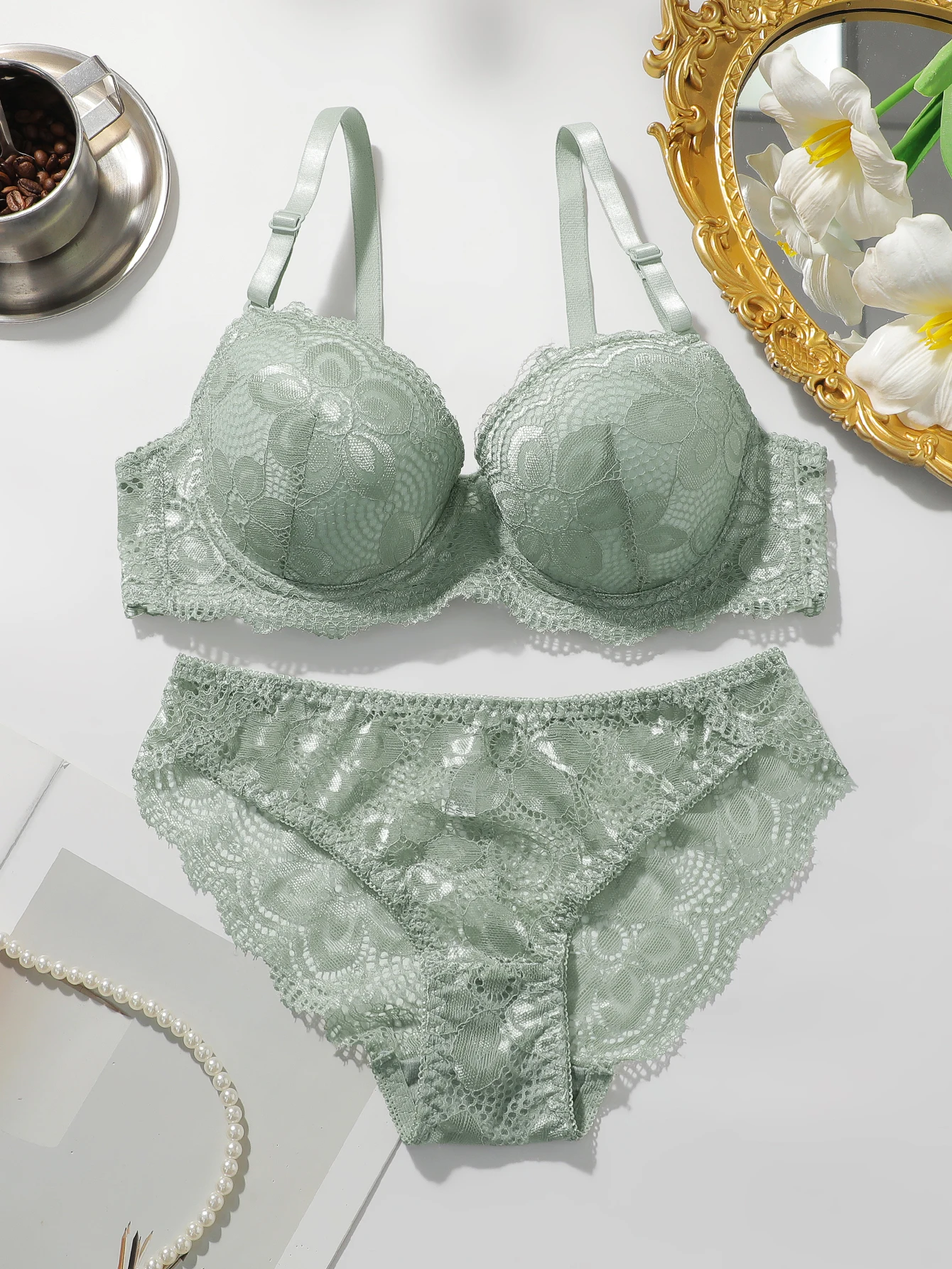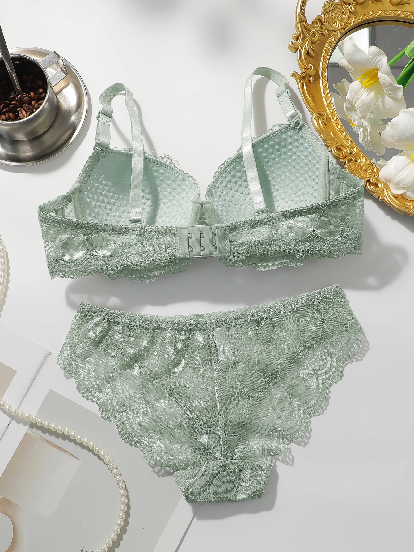This 2-piece set features a blend of spandex and polyamide, providing stretch and durability for a comfortable and long-lasting fit. The floral design adds a feminine touch while the materials offer support and softness. Perfect for everyday wear or special occasions.
